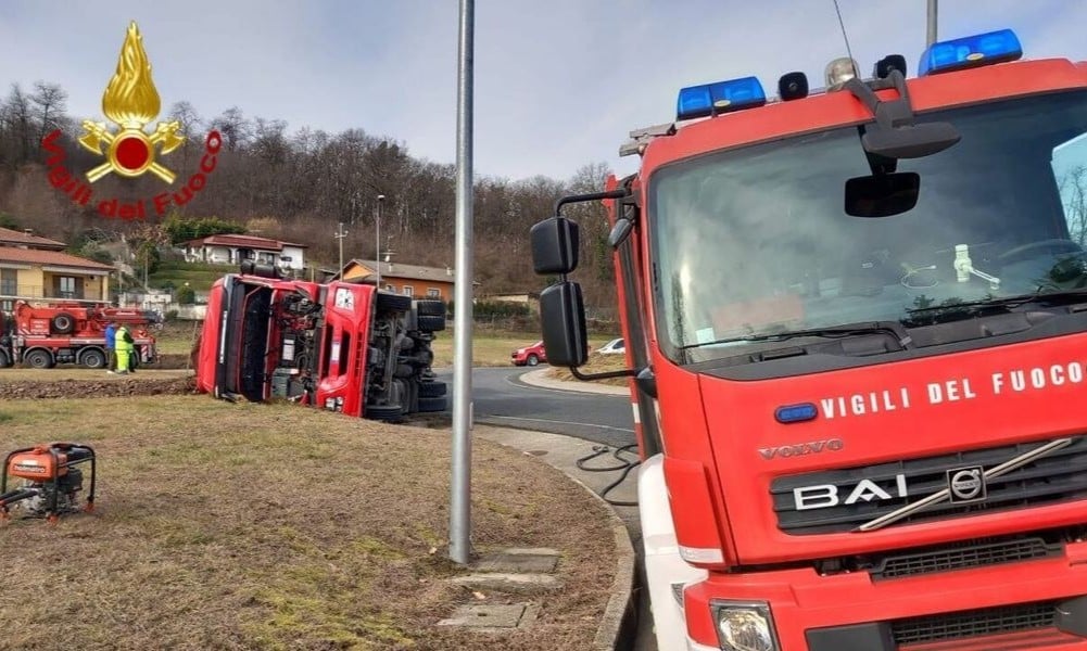 Camion si ribalta nella rotonda, il conducente prigioniero nell’abitacolo. L’uomo è stato infine liberato e poi portato al pronto soccorso di Borgomanero.